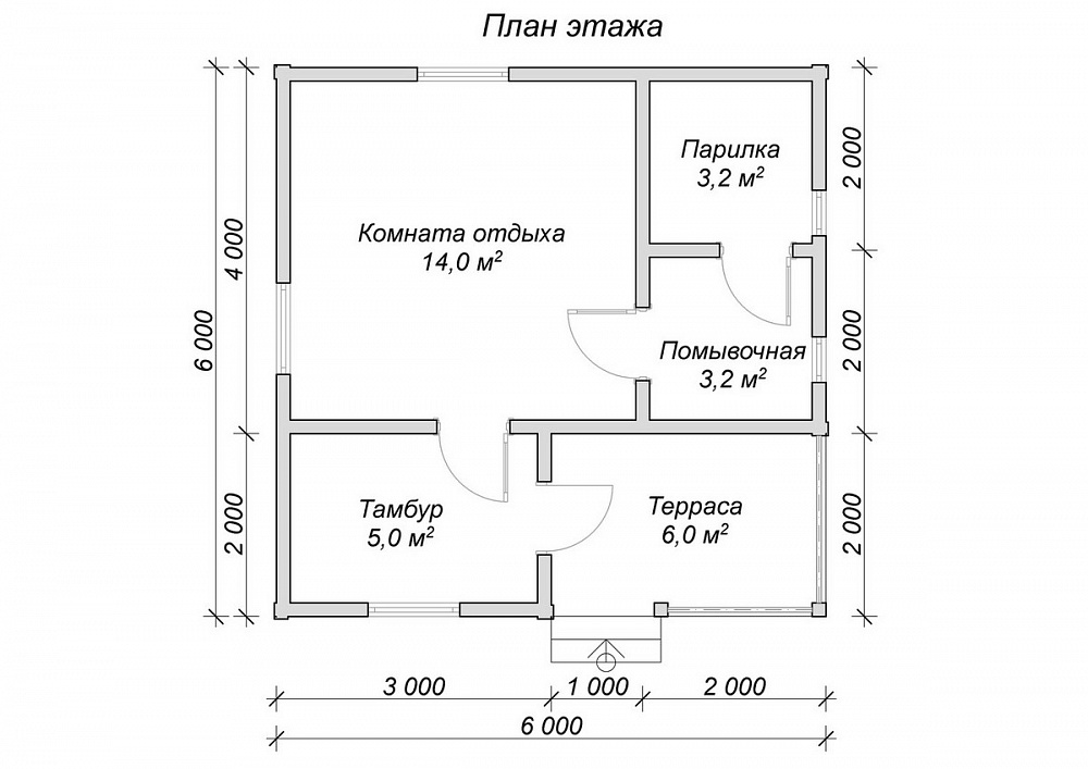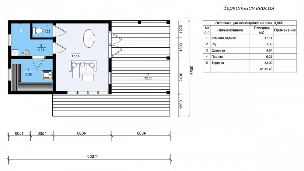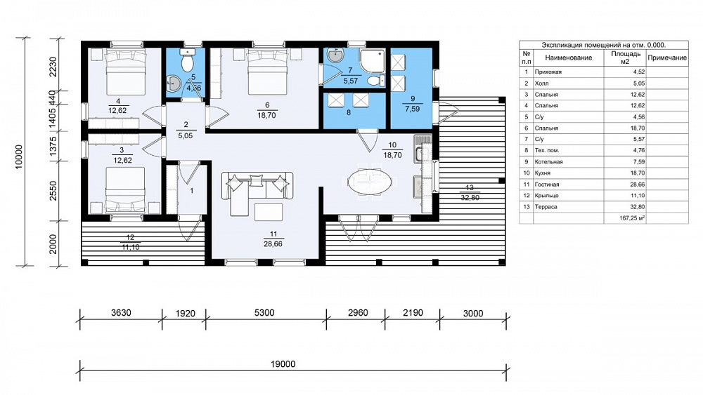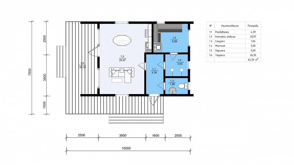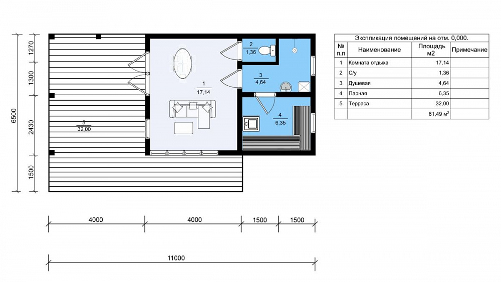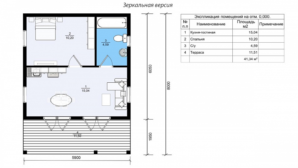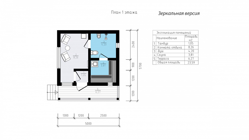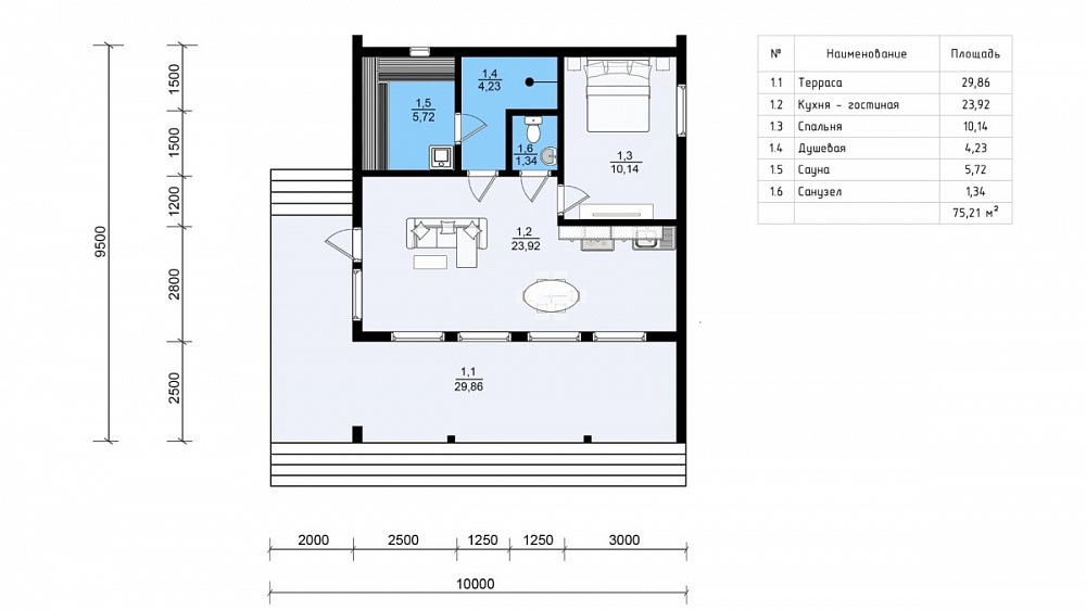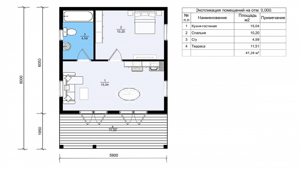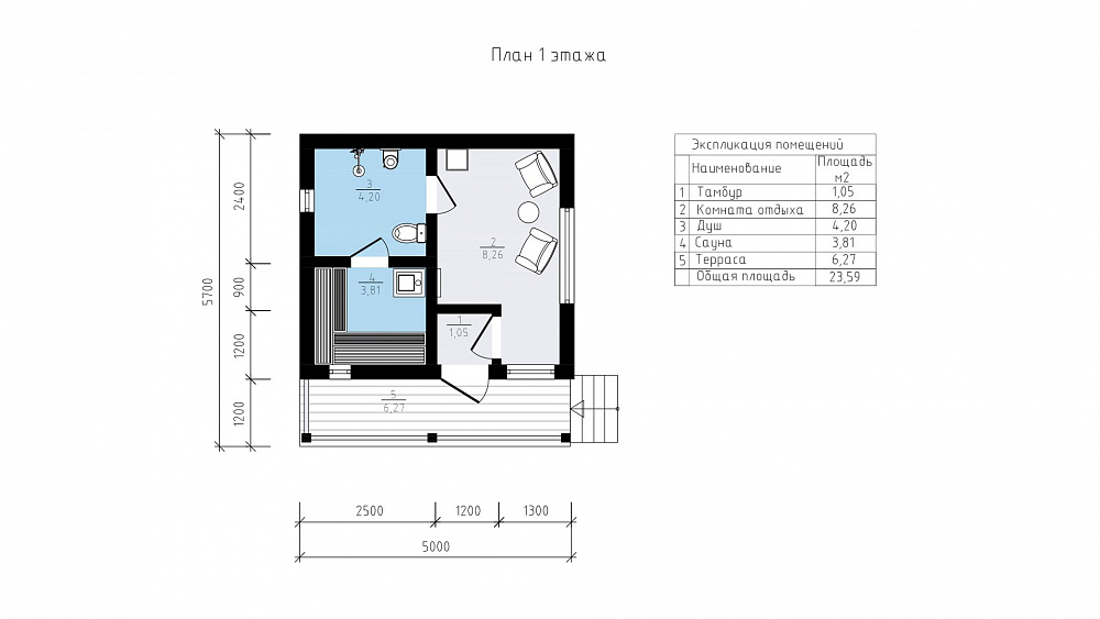 Маленький домик с большой террасой для Все нужные помещения для максимального отдыха. В проекте надежный свайный фундамент, 23шт