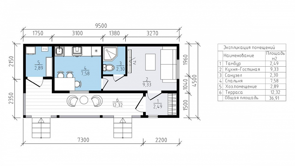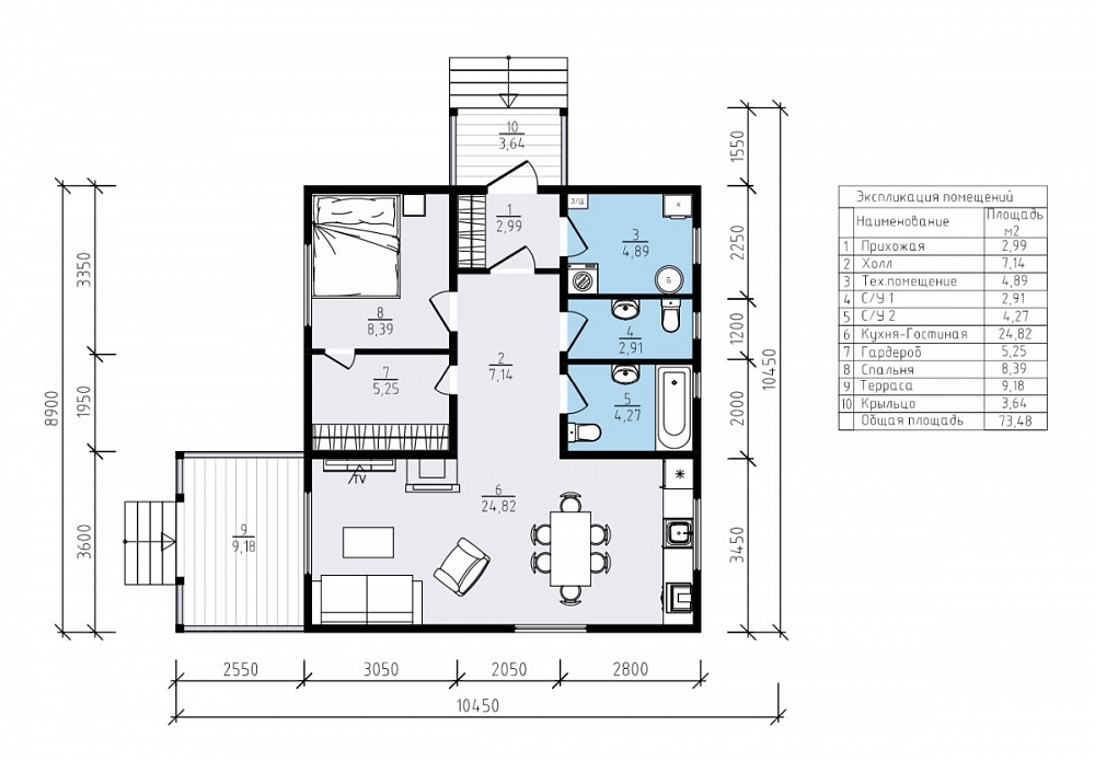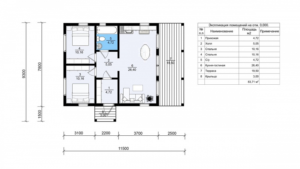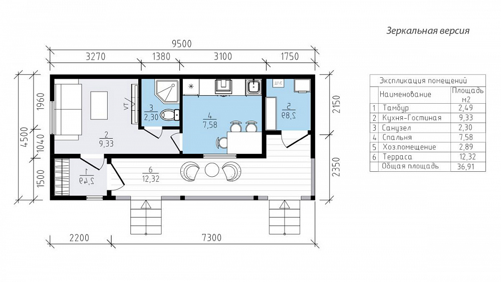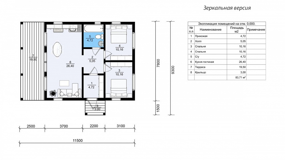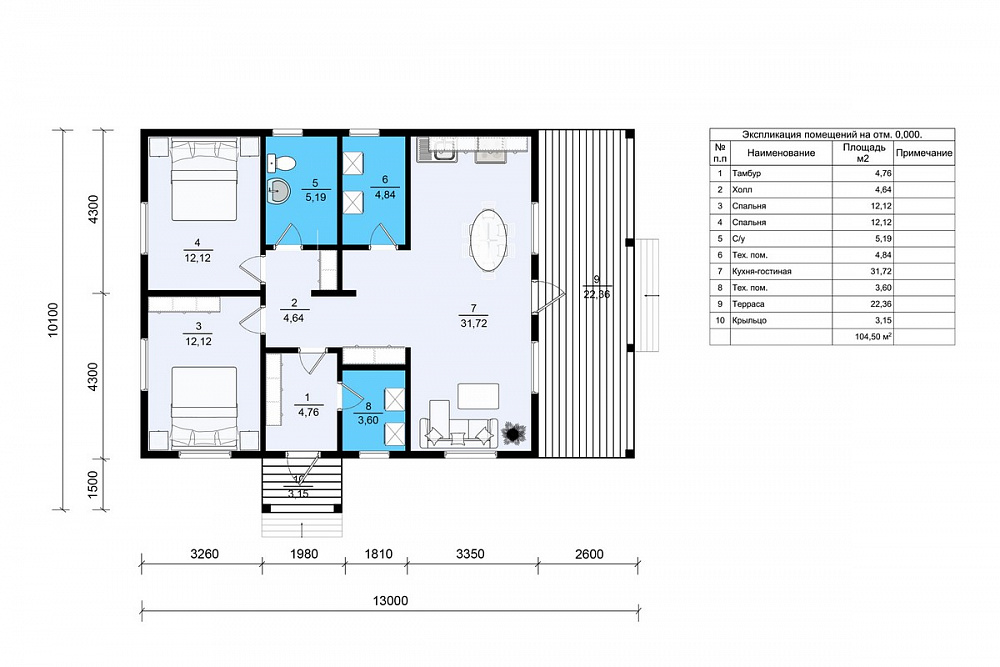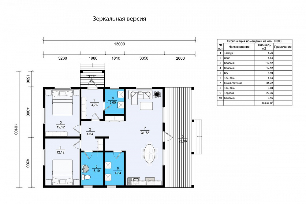 Гармоничный проект дома. Просторная кухня-гостиная с выходом на роскошную террасу, 2 спальни, санузел, технические помещения, теплый тамбур. Фундамент сваи (31шт)