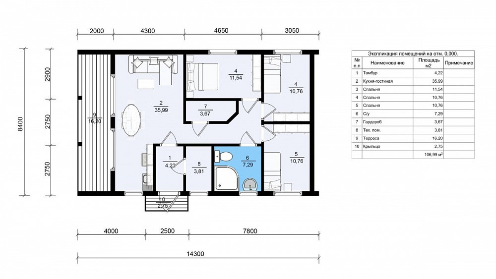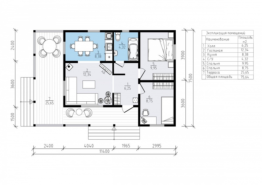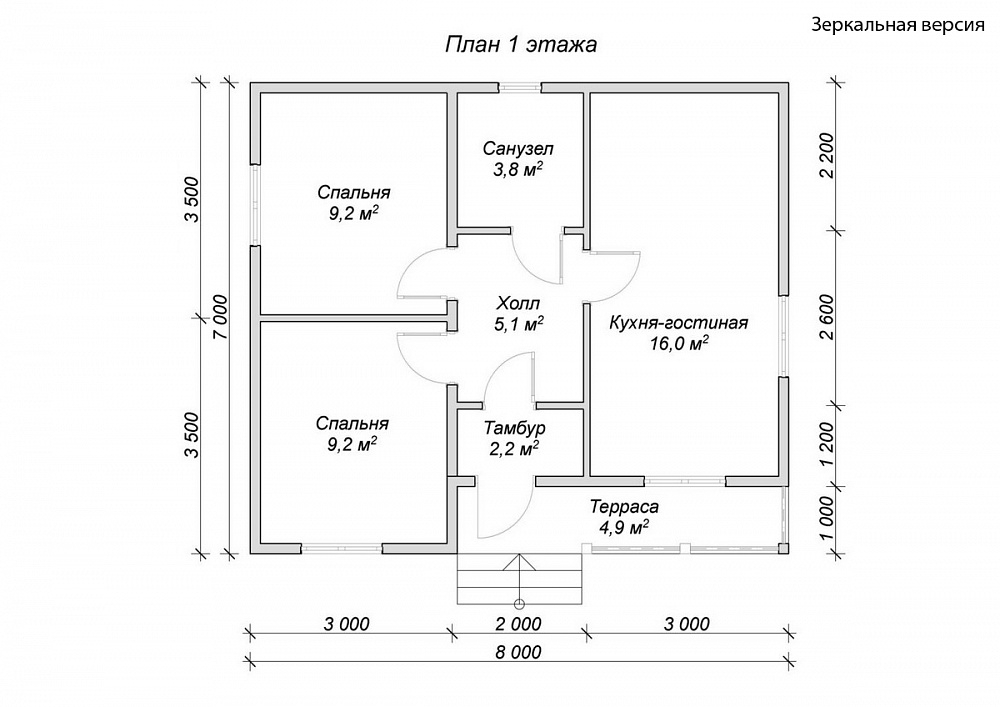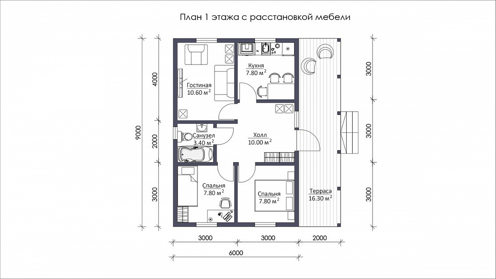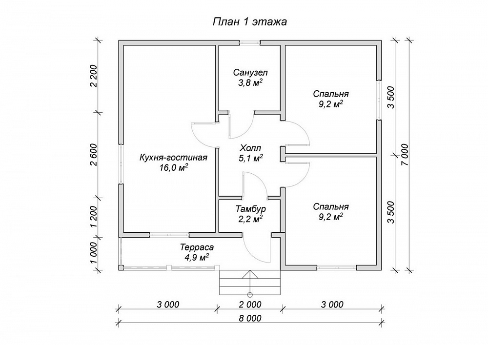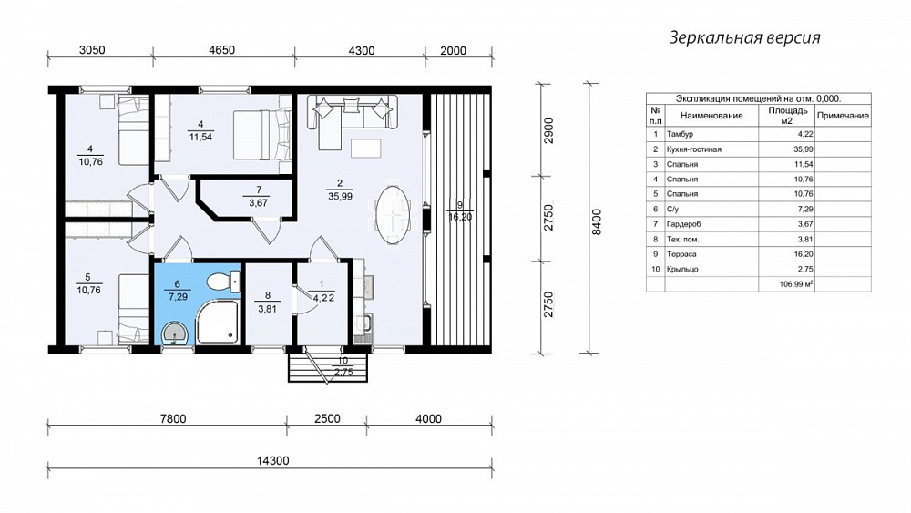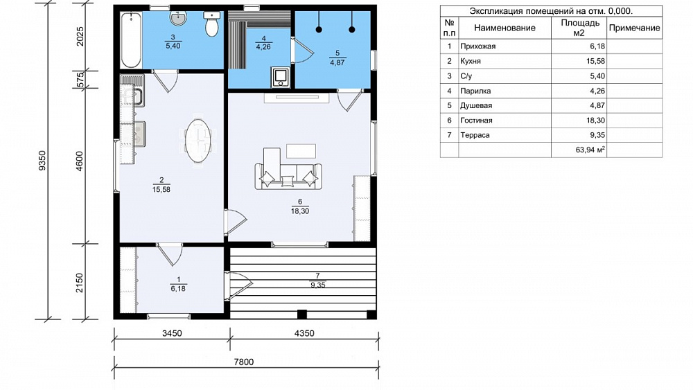 Гармоничный проект дома. Просторная кухня-гостиная с выходом на роскошную террасу, 2 спальни, санузел, технические помещения, теплый тамбур. Фундамент сваи (31шт)