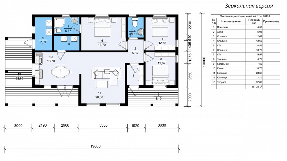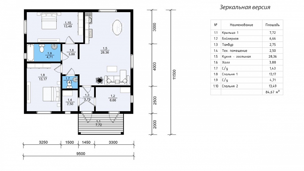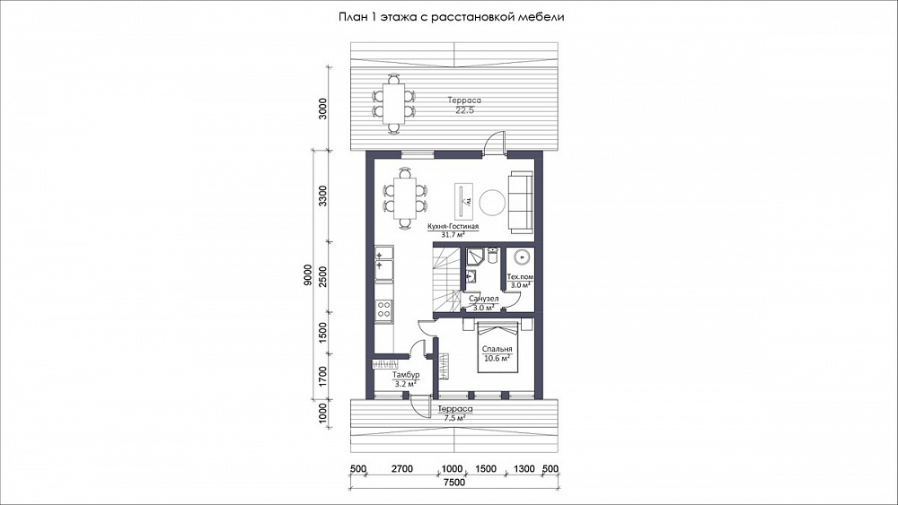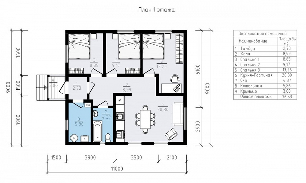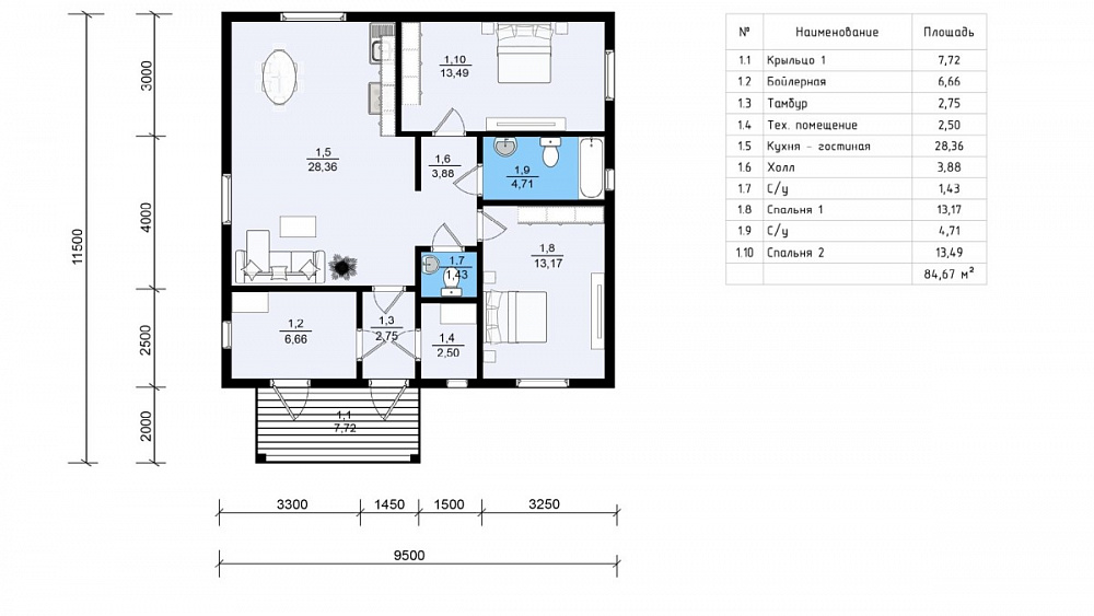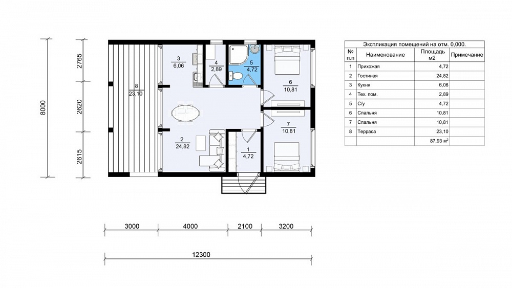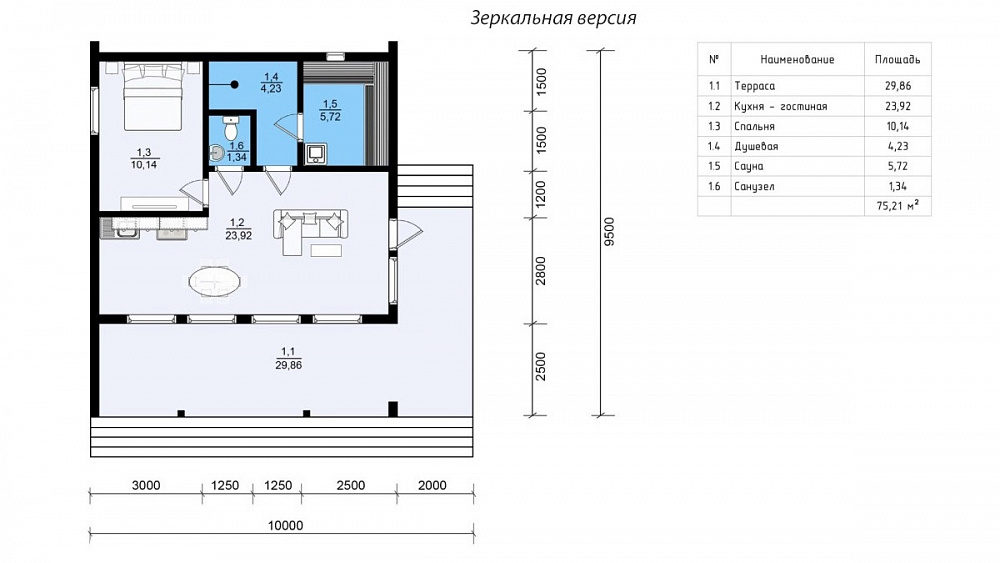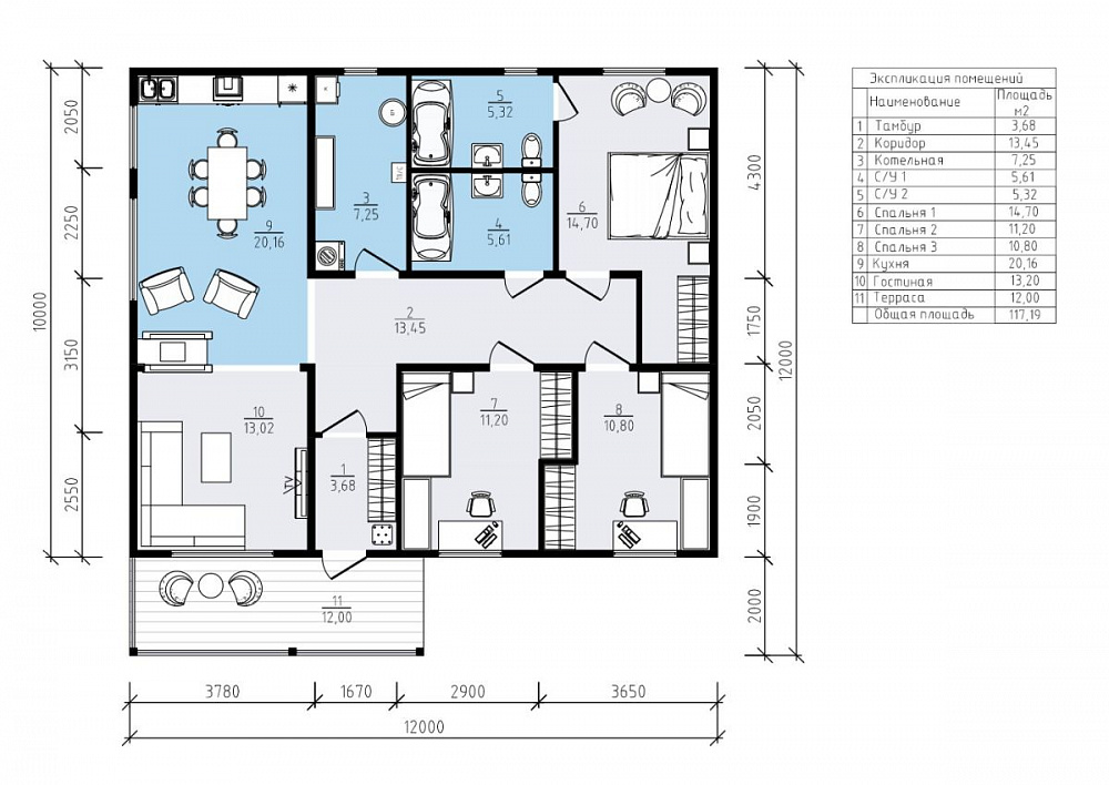 Гармоничный проект дома. Просторная кухня-гостиная с выходом на роскошную террасу, 2 спальни, санузел, технические помещения, теплый тамбур. Фундамент сваи (31шт)