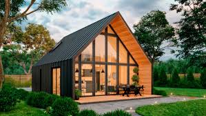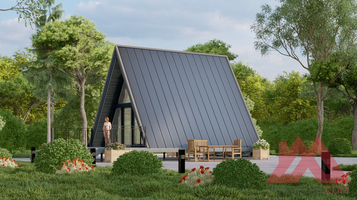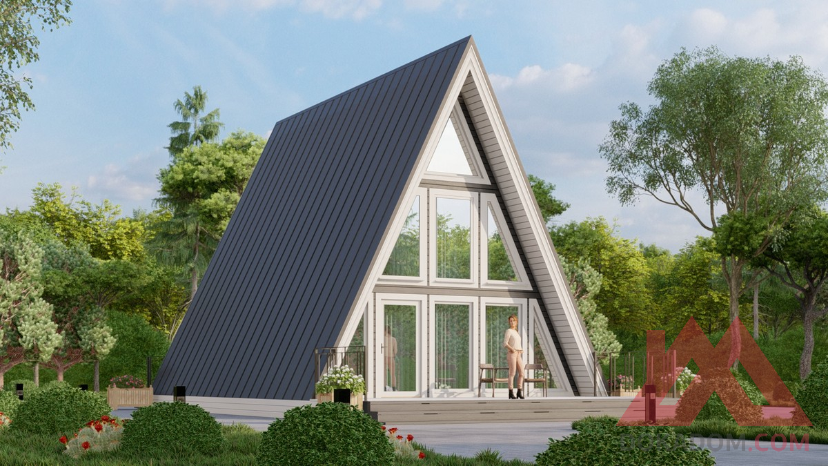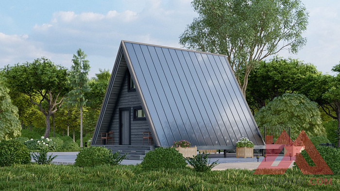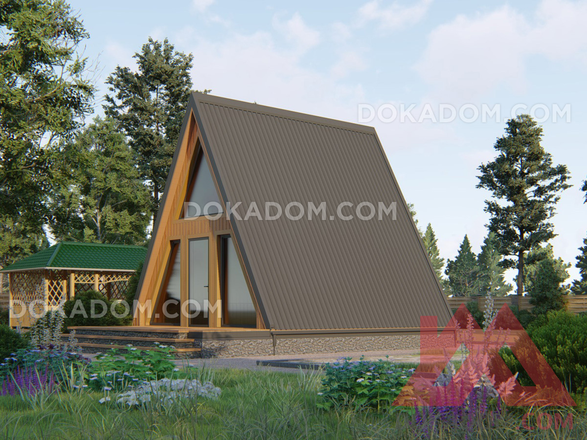 Компактный дом в стиле А-фрейм 2х эт , как для сезонного, так и постоянного проживания за счет толщины каркаса 150 мм и перекрытий 200 мм.. В проекте 18 свай.