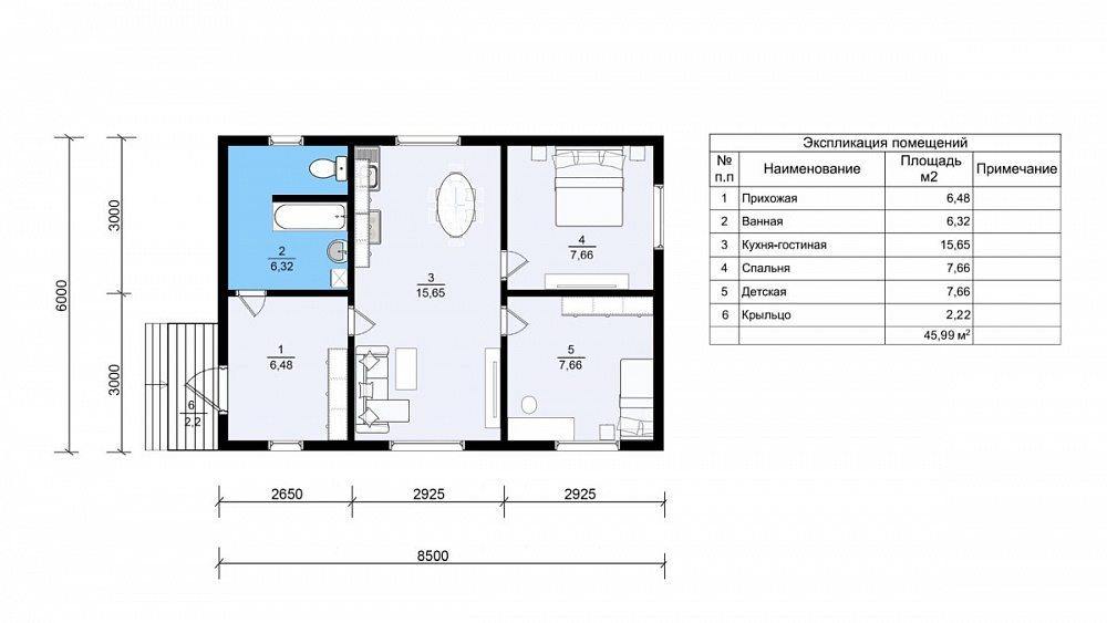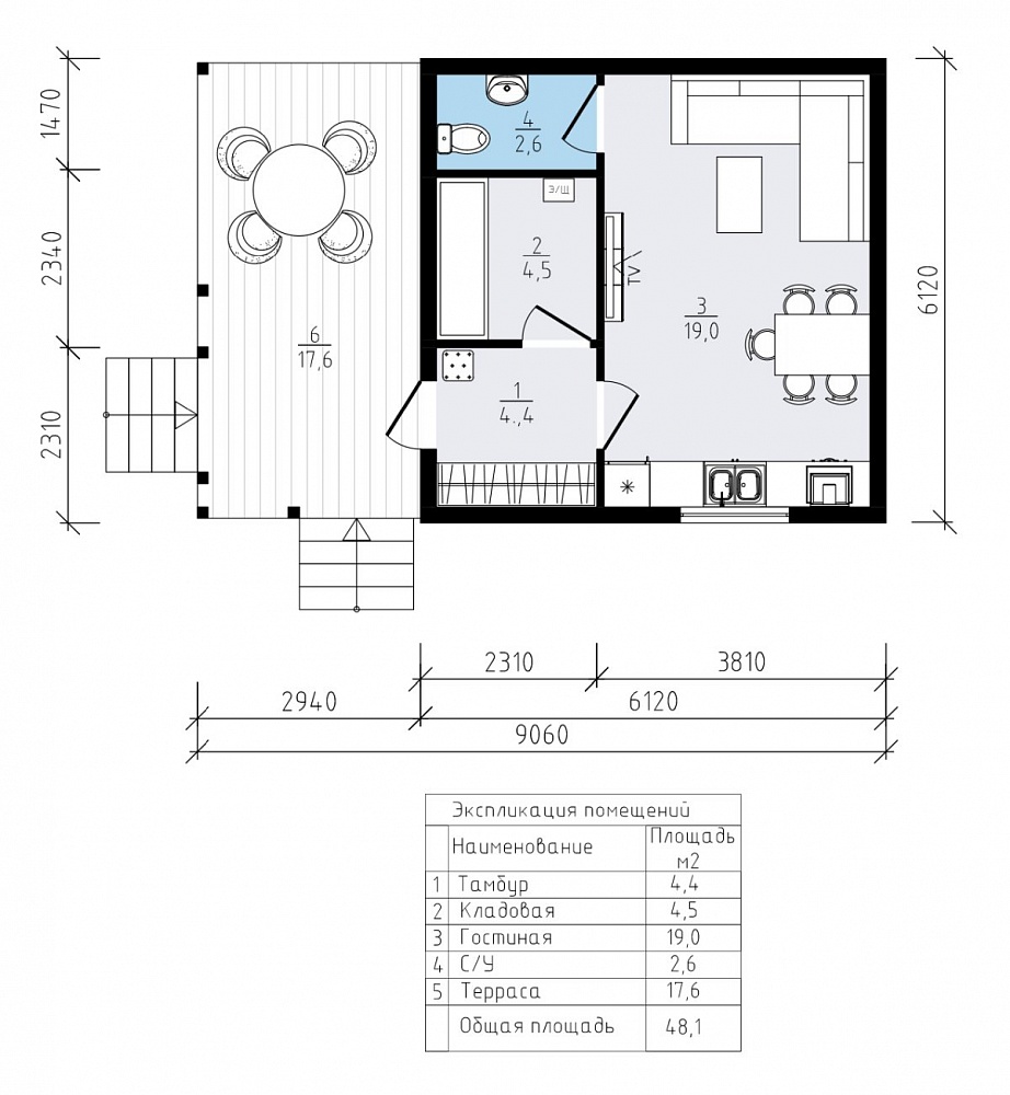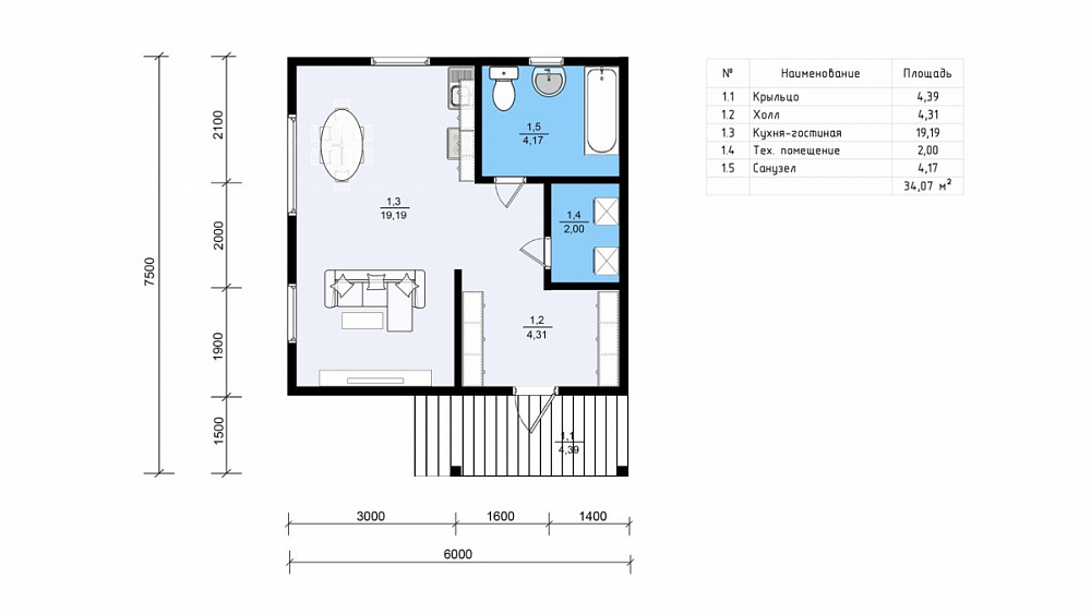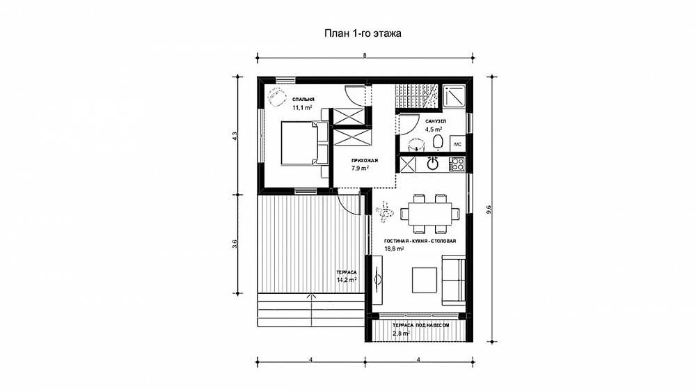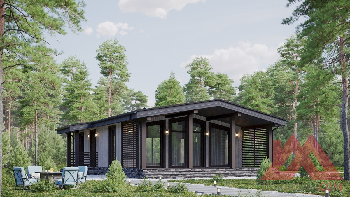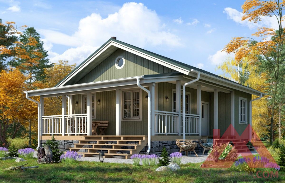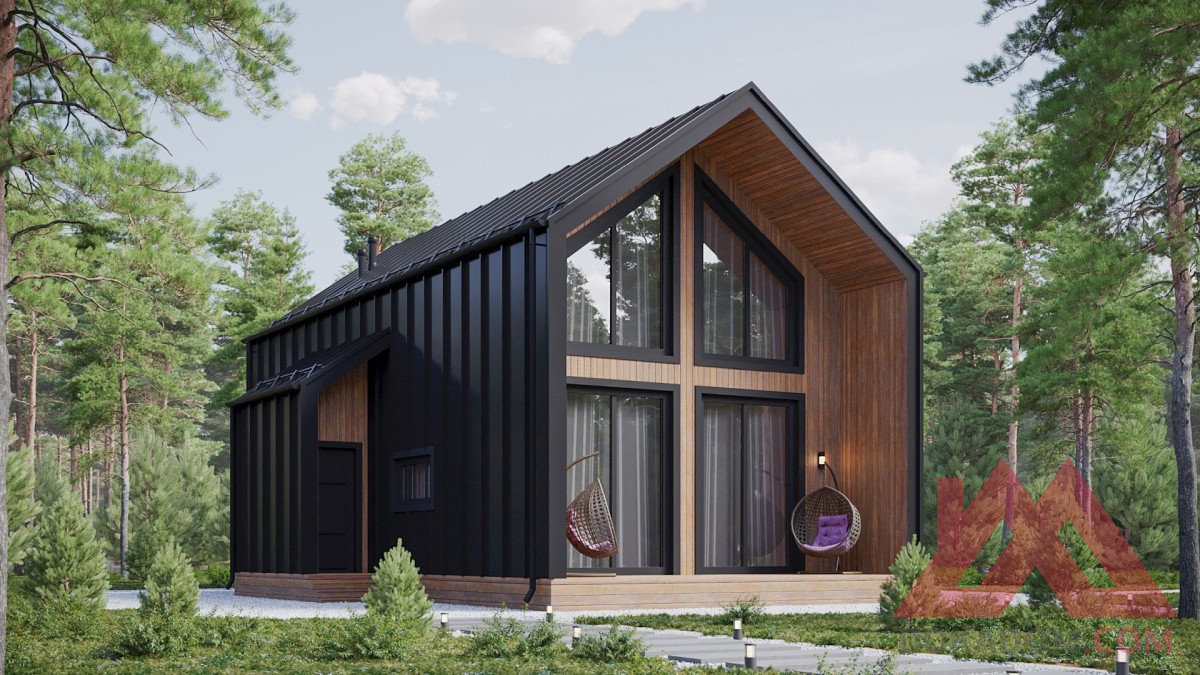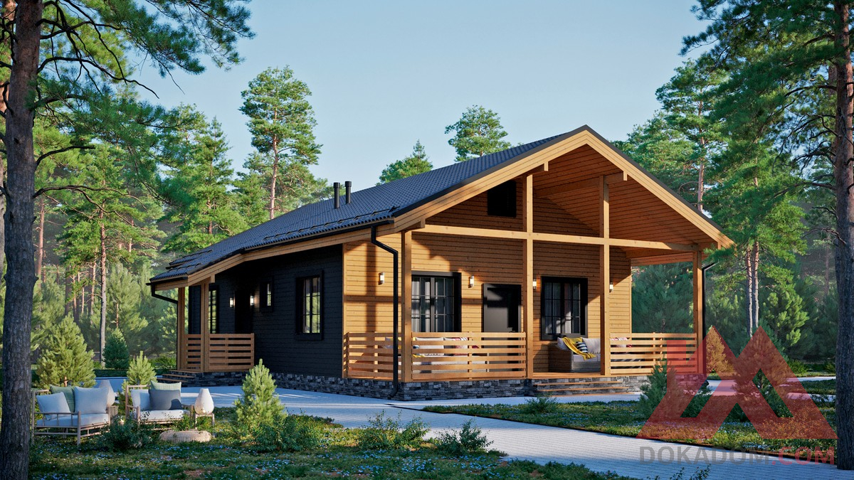 Проект уютного дома для жизни и отдыха: В проекте просторная кухня-гостиная, одна спальня и полноценный санузел.