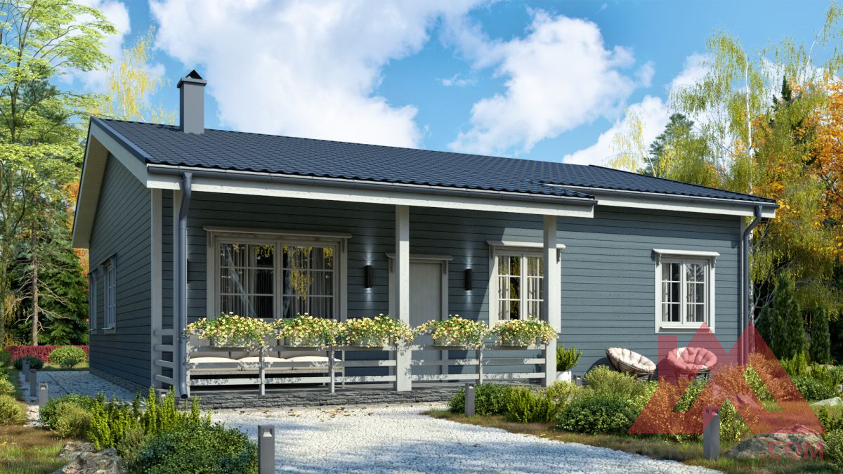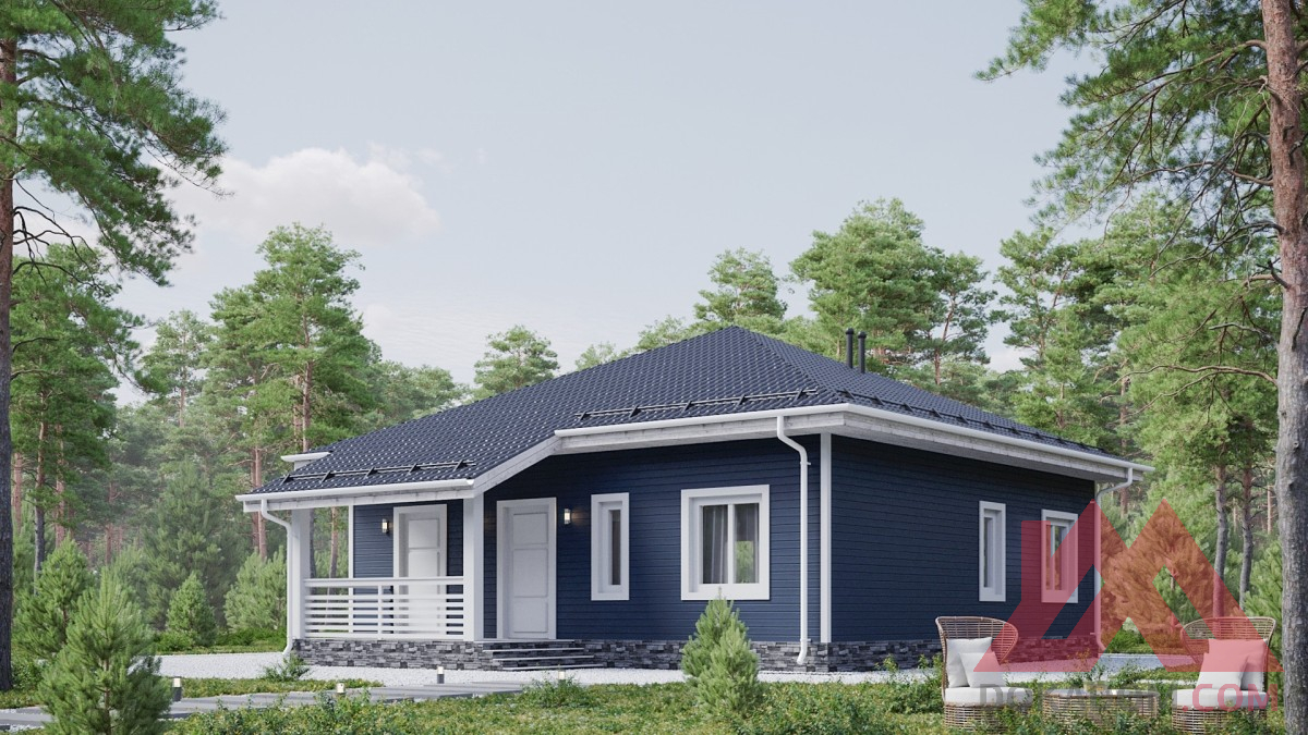 Дом по финским мотивам. В доме 3 спальни, санузел, котельная, просторная прихожая. Фундамент в проекте: 1.Свайный (26 свай), 2. Мелкозаглубленный ленточный
