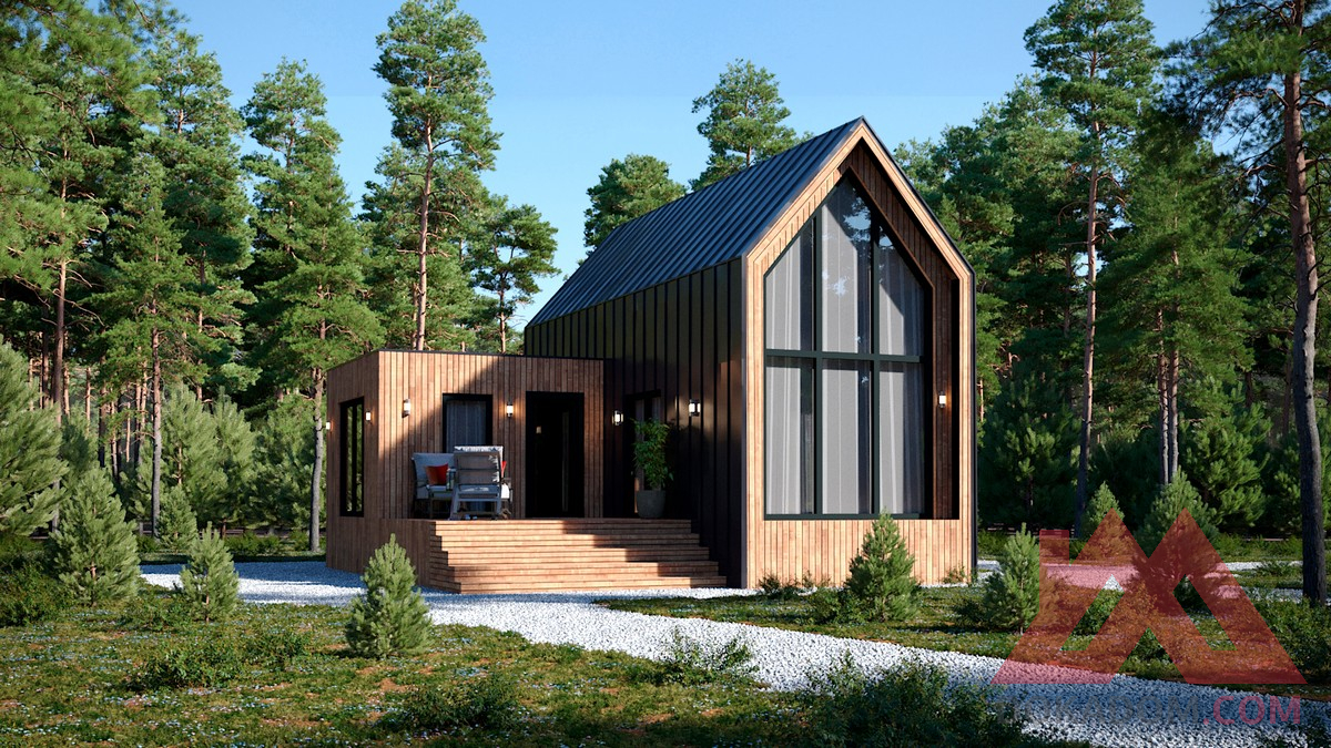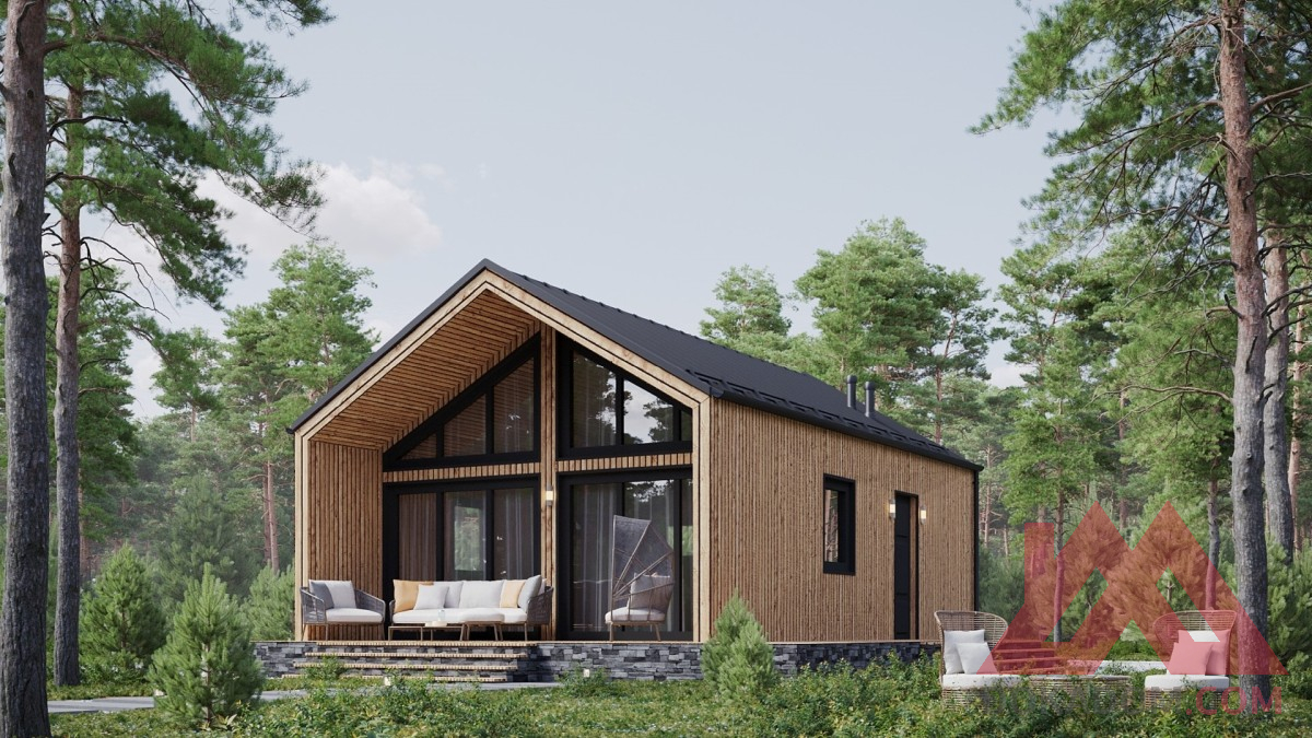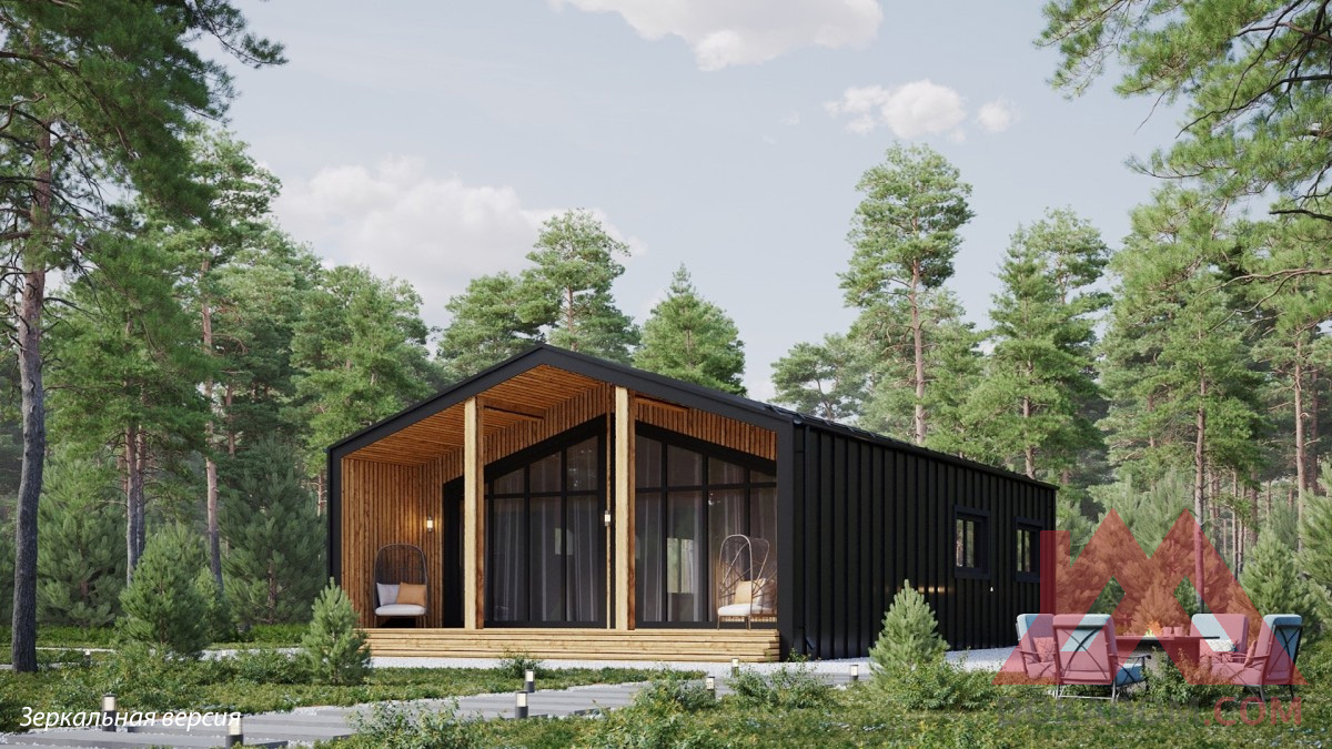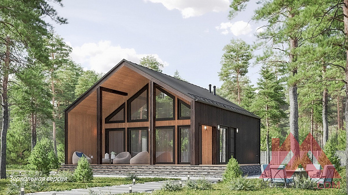 Проект дома в стиле Барн. Большая гостиная-кухня с панорамным остеклением и террасой под крышей, 2 спальни и санузел. Каркас выполнен из доски 50*150 и 50*200 мм. Фундамент - свайное поле (24 сваи).