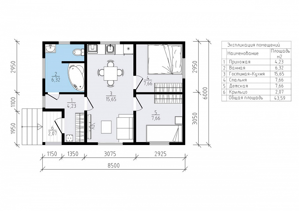 Просторный дом для большой семьи. В доме 2 спальни и просторный санузел, гостиная-кухня, с которой имеется выход на небольшую террасу.