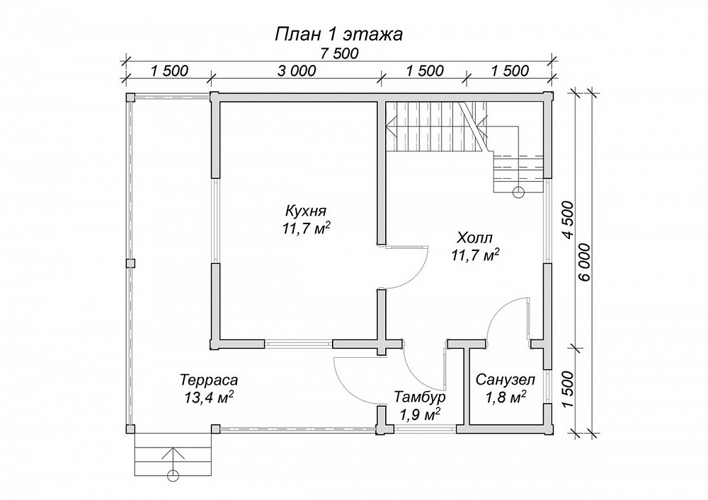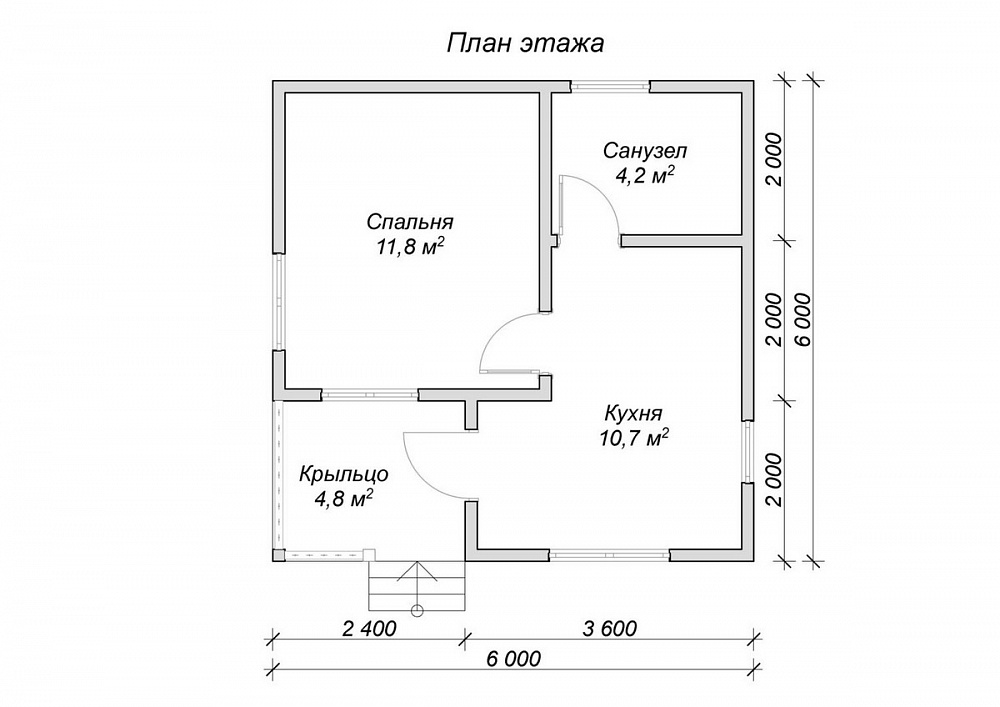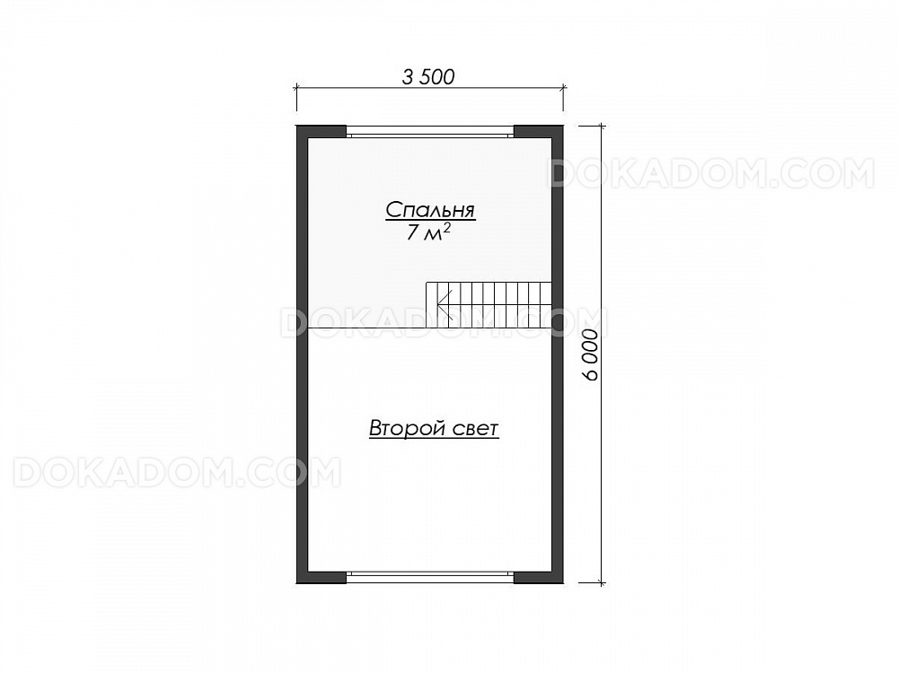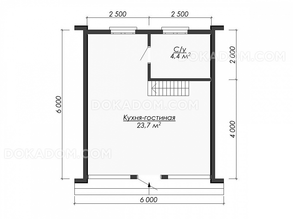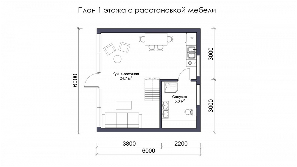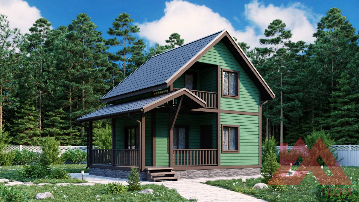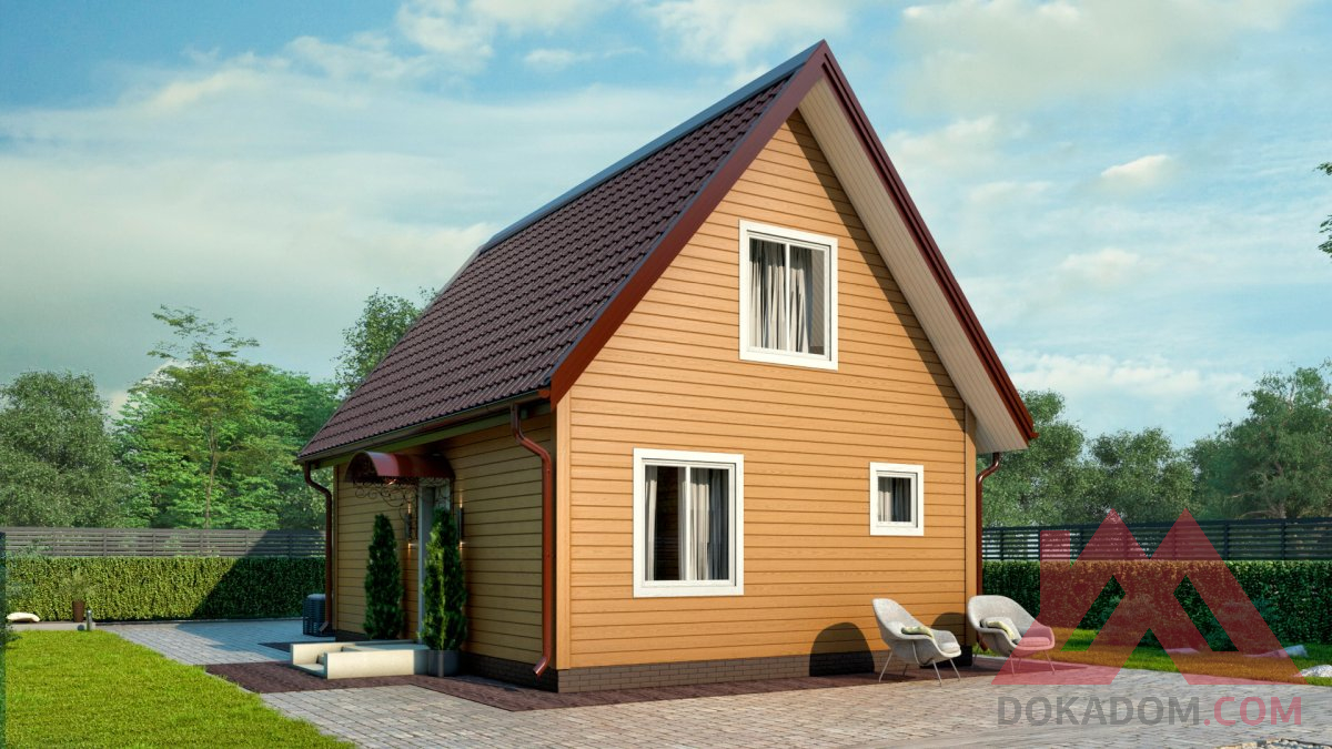 Классический каркас дом 6*6 с мансардным этажом. На первом этаже просторная гостиная и небольшая кухня.