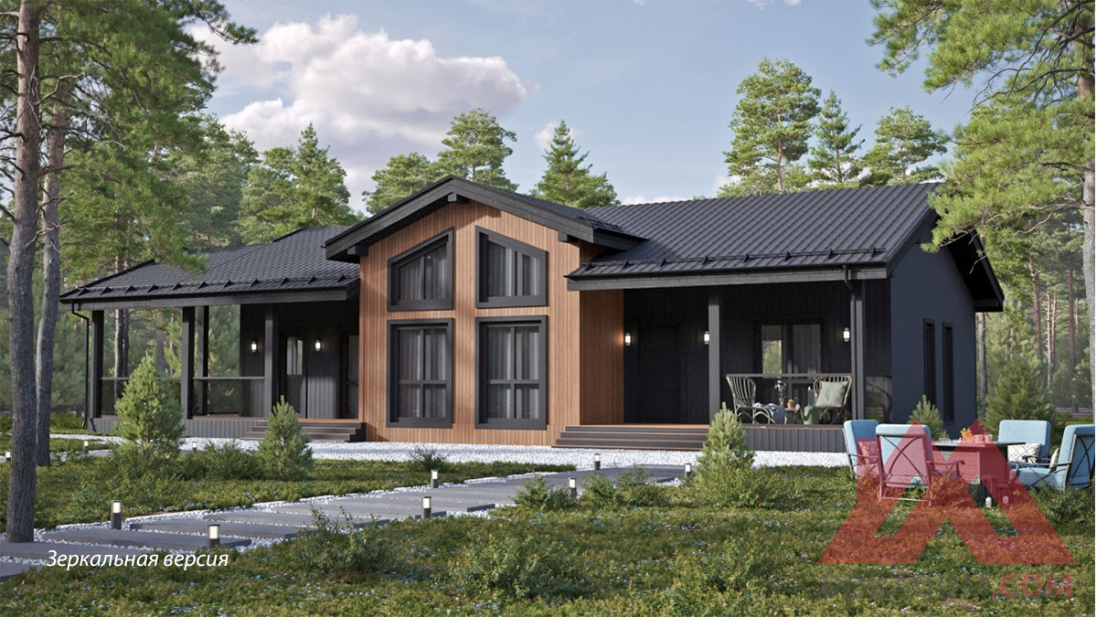 Просторный дом в стиле барнхаус с большой террасой и панорамным остеклением. В проекте свайный фундамент (22 сваи).
