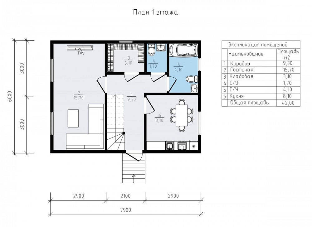 Дом. проекте теплый тамбур-прихожая, просторная кухня, отдельный санузел. Фундамент в проекте - свайный (20 шт), под винтовые или ЖБ на ваш выбор.